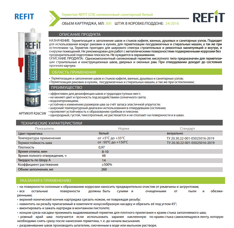 Применяется для герметизации и заполнения швов между керамическими плитками в ванных, душевых и санитарных узлах. Подходит для использования вокруг раковин в кухнях, для герметизации посудомоечных и стиральных машин, а так же при остеклении и т.д. Герметик пригоден для широкого спектра строительных и ремонтных манипуляций и внутри, и снаружи помещений.